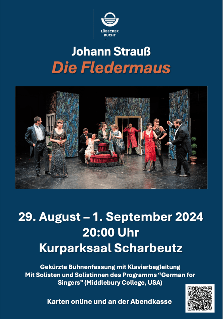 Projekt 2024: Johann Strauß, “Die Fledermaus.” Gekürzte Fassung mit Klavier. 29. August – 1. September 2024, Kurparkhaus Scharbeutz.