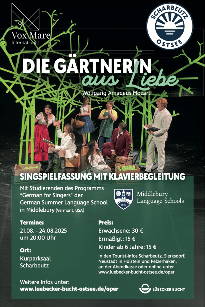 Unser Projektpartner für Opernprojekte in Scharbeutz ist seit 2023 das German for Singers Programm an der deutschen Sommeruniversität (der German Summer Language School) des Middlebury Colleges in Vermont (USA). Kooperationspartner vor Ort ist derzeit die Tourismus Agentur Lübecker Bucht.